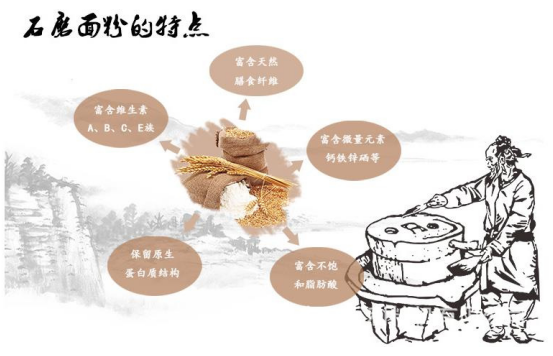 石磨面粉和普通的机磨相比,在很多方面都有着其独特的优势。从加工工艺来看,普通机磨面粉所使用的磨粉机运转速度快,加工温度高,对一些像蛋白质、热敏性维生素等营养物质有很大的影响;与之相比,石磨面粉所采用的传统石磨有着低转速、低温度的优良特点,减少了营养素的流失,而且还可以保留麦子当中独特的香味。从营养价值上来看,石磨面粉所加工的大多都是全麦面粉,而现如今利用机磨加工出的面粉大多是精白面粉,相比而看机磨面粉就有了很大的损失,例如全麦面粉当中的B族维生素、矿物质和膳食纤维都是比较丰富的,特别是维生素B1,它主要存在于谷物当中的谷皮和糊粉层中,而机磨面粉由于速度过快,对B1造成的损失较大;由于石磨加工的温度低、速度慢,所以损失较小,而机磨加工本身就温度高、速度快,对一些维生素和矿物质损害都是较大的。